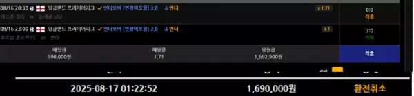 피해자는 EPL 개막을 맞아 벳지노에서 스포츠 2폴더 배팅을 진행했습니다. 배팅은 정상적으로 적중되었고, 환전을 요청했으나 사이트 측에서 "시간차 배팅" 등 모호한 배팅 위반을 이유로 당첨금 1,690,000원을 전액 몰수했습니다. 더불어 피해자의 계정은 즉시 차단되어 어떠한 소명 기회도 제공되지 않았습니다. 피해자는 "잃으면 정상 처리하고, 돈을 따면 위반이라며 먹튀하는 사이트"라고 강하게 비판하며, 다른 사용자들에게 주의를 당부했습니다.