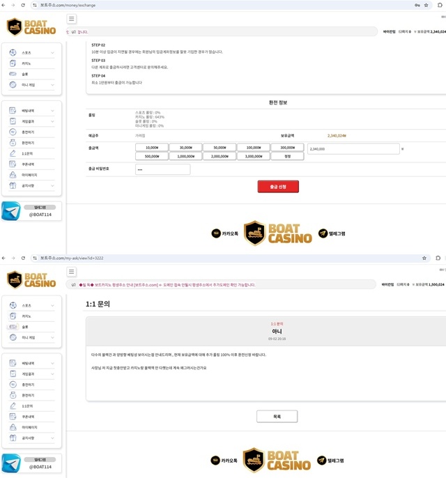 2025년 9월 3일, **보트카지노(보트주소.com)**에서 234만원 규모의 먹튀 사건이 발생했습니다. 피해자는 카지노 생중계 배팅으로 900% 롤링 조건을 충족하고 당첨금을 획득했으나, 사이트가 원금은 물론 단 1원도 환전하지 않았습니다.