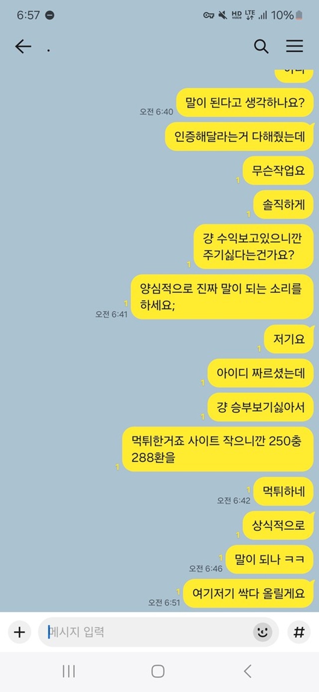 피해자는 노마드(nmd-5959.com)에서 배팅을 통해 288만 원의 당첨금을 획득했습니다. 하지만 환전 신청 후 사이트 측에서 "작업 배팅"을 이유로 당첨금을 몰수했습니다. 피해자가 항의하자, 사이트는 다른 회원이 140만 원 충전 후 140만 원 환전했으니 원금 손실이 없다는 터무니없는 변명을 늘어놓으며 돈을 지급하지 않았습니다. 더 나아가 사이트는 전화로 협박과 핑계로 회원을 겁주고 농락하며 계정을 차단했습니다. 피해자는 이를 "개 구멍가게"라며 분노를 표출하며, 다른 이용자들에게 이용 중지를 강력히 권고했습니다.