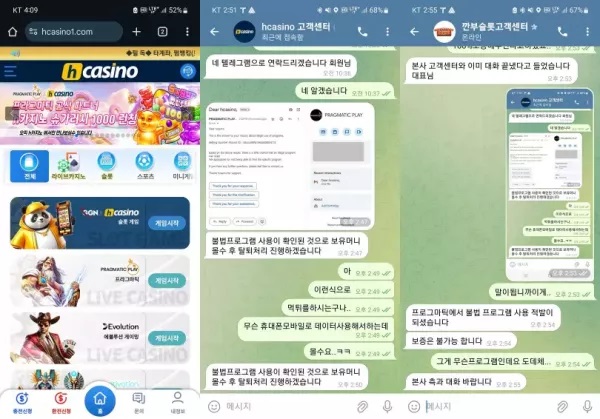 피해자는 유튜브 '깐부 슬롯' 채널의 추천으로 hcasino1.com에 가입해 슬롯 게임을 즐겼습니다. 소액으로 큰 수익을 기대하며 게임을 진행한 뒤, 환전 신청을 했습니다. 하지만 사이트는 텔레그램으로 연락 후, 불법 프로그램 사용을 이유로 든 이상한 영어 이메일을 보여주며 3,600만 원 전액을 몰수하고 아이디를 강제 탈퇴시켰습니다. 피해자는 어떠한 소명 기회도 받지 못한 채 큰 손실을 입었습니다.