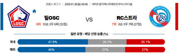 01월26일 릴:스트라스부르 리그앙 분석 및 예측 스포츠중계:스포츠무료중계