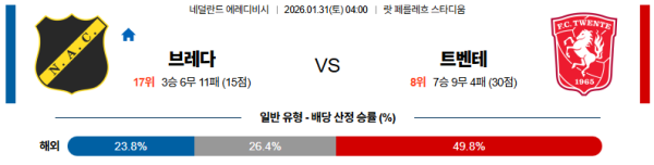 01월31일 트벤테:브레다 에레디비지 분석 및 예측 스포츠중계:스포츠무료중계