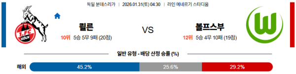 01월31일 쾰른:볼프스부르크 분데스리가 분석 및 예측 스포츠중계:스포츠무료중계
