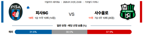 01월31일 피사SC:사수올로 세리에A 분석 및 예측 스포츠중계:스포츠무료중계