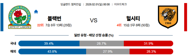 02월01일 블랙번:헐시티 잉글랜드챔피언쉽 분석 및 예측 스포츠중계:스포츠무료중계