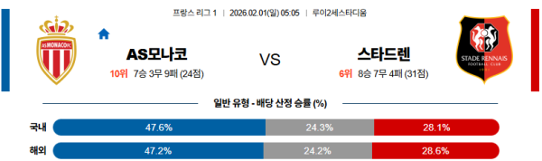 02월01일 AS모나코:스타드렌 리그앙 분석 및 예측 스포츠중계:스포츠무료중계