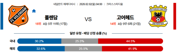 02월02일 폴랜담:고어헤드이글스 에레디비지 분석 및 예측 스포츠중계:스포츠무료중계