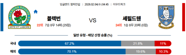 02월04일 블랙번:셰필드웬즈데이 잉글랜드챔피언쉽 분석 및 예측 스포츠중계:스포츠무료중계