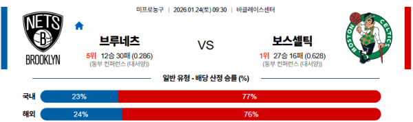 01월24일 브루클린:보스턴 NBA 분석 및 예측 스포츠중계:스포츠무료중계