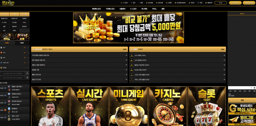 | 게임 종류 | 해외형스포츠, 국내형스포츠, 인플레이, E-스포츠, 미니게임, 카지노, 슬롯 |